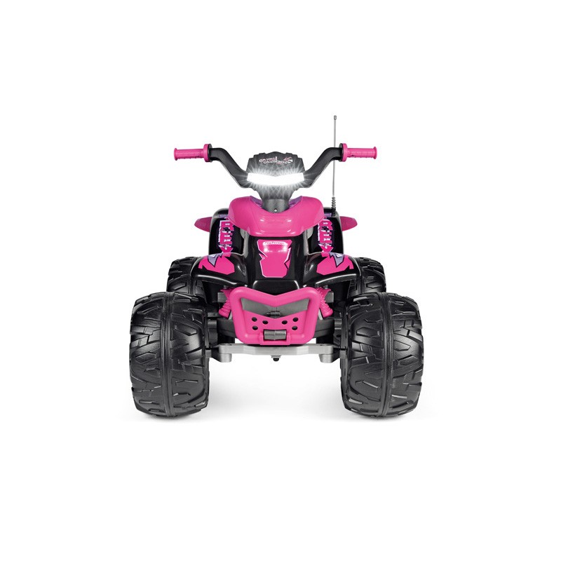 Das Corral T-Rex 330W pink ist ein Quad mit Offroad-Charakter. Der große Sitz garantiert Komfort für große und kleine Fahrerinnen. Es erreicht eine Höchstgeschwindigkeit von zirka 7 km/h und nimmt es dank der vier großen Räder, der vorderen Stoßstange, die beim Aufprall schützt, und den Schmutzfängern, die Schmutzwasser abhalten, mit jedem Geländeweg auf.