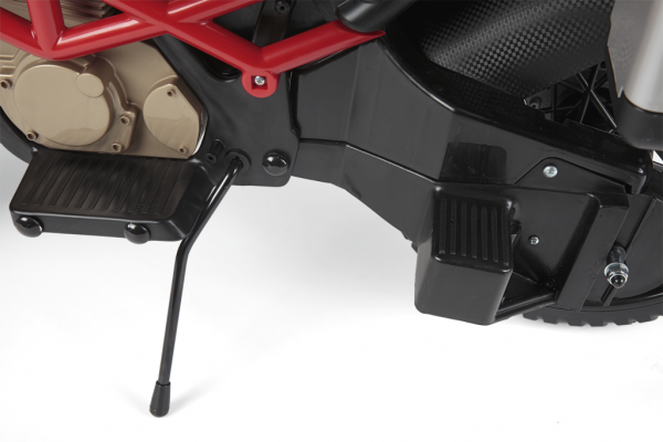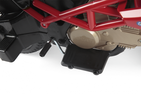 Die Ducati Hypercross kann mit zwei Geschwindigkeiten fahren. Entscheiden Sie durch Drücken auf den Knopf unter dem Sitz. Die (abnehmbaren) Stützräder sind ideal für kleine, noch unsichere Fahrer geeignet. Der robuste Lenker aus lackiertem Eisen garantiert einen sicheren Halt bei Geländefahrten. Die mit rutschfestem Gummi bezogenen Griffe und die umhüllenden Handschützer schützen Hände und Finger auch von der Seite.