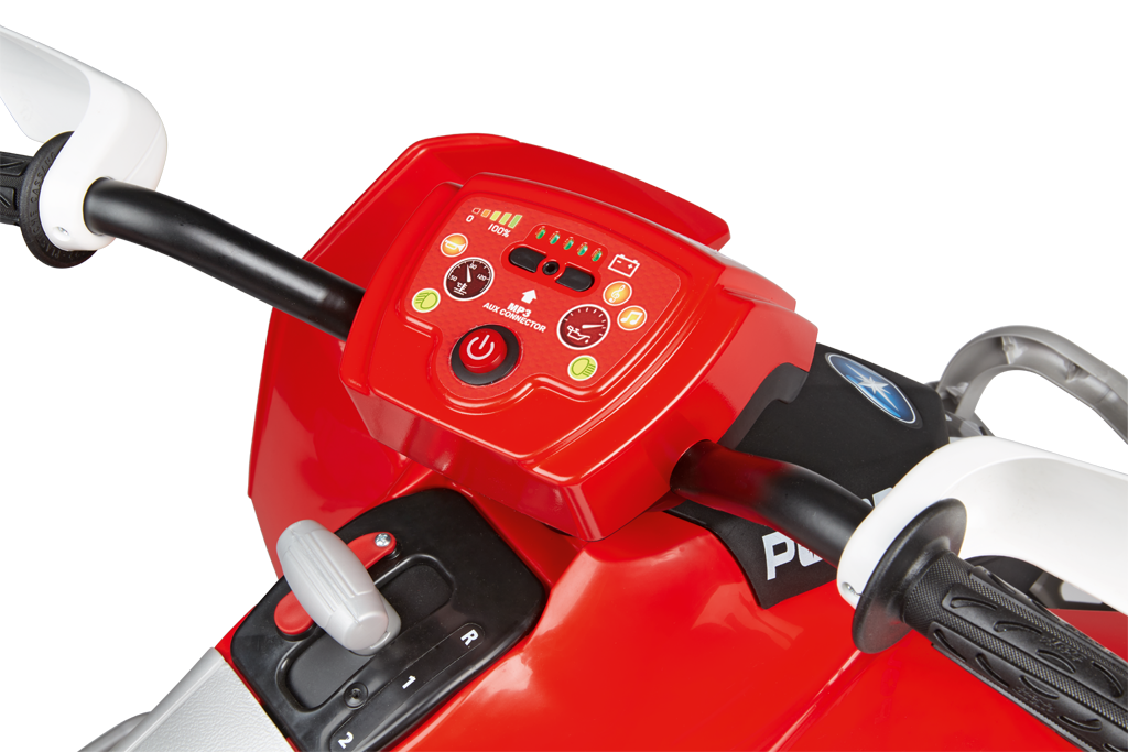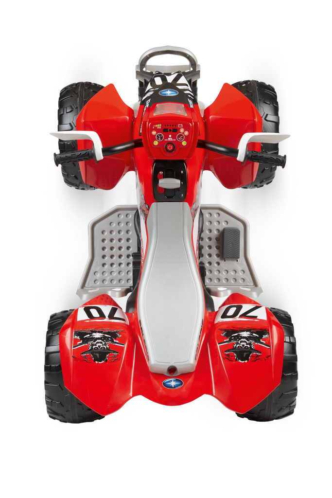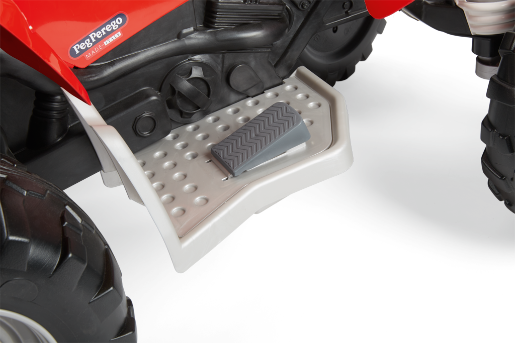 Die Qualität der Produkte von Peg Perego ist an den Einzelheiten zu erkennen, die die Sicherheit garantieren. Das Polaris Outlaw hat einen geschlossenen Unterboden, um den Fahrer vor Stromkabeln und eventuellen Verletzungen zu schützen und Spritzwasser, Matsch und Sand vom Fahrzeug fern zu halten.