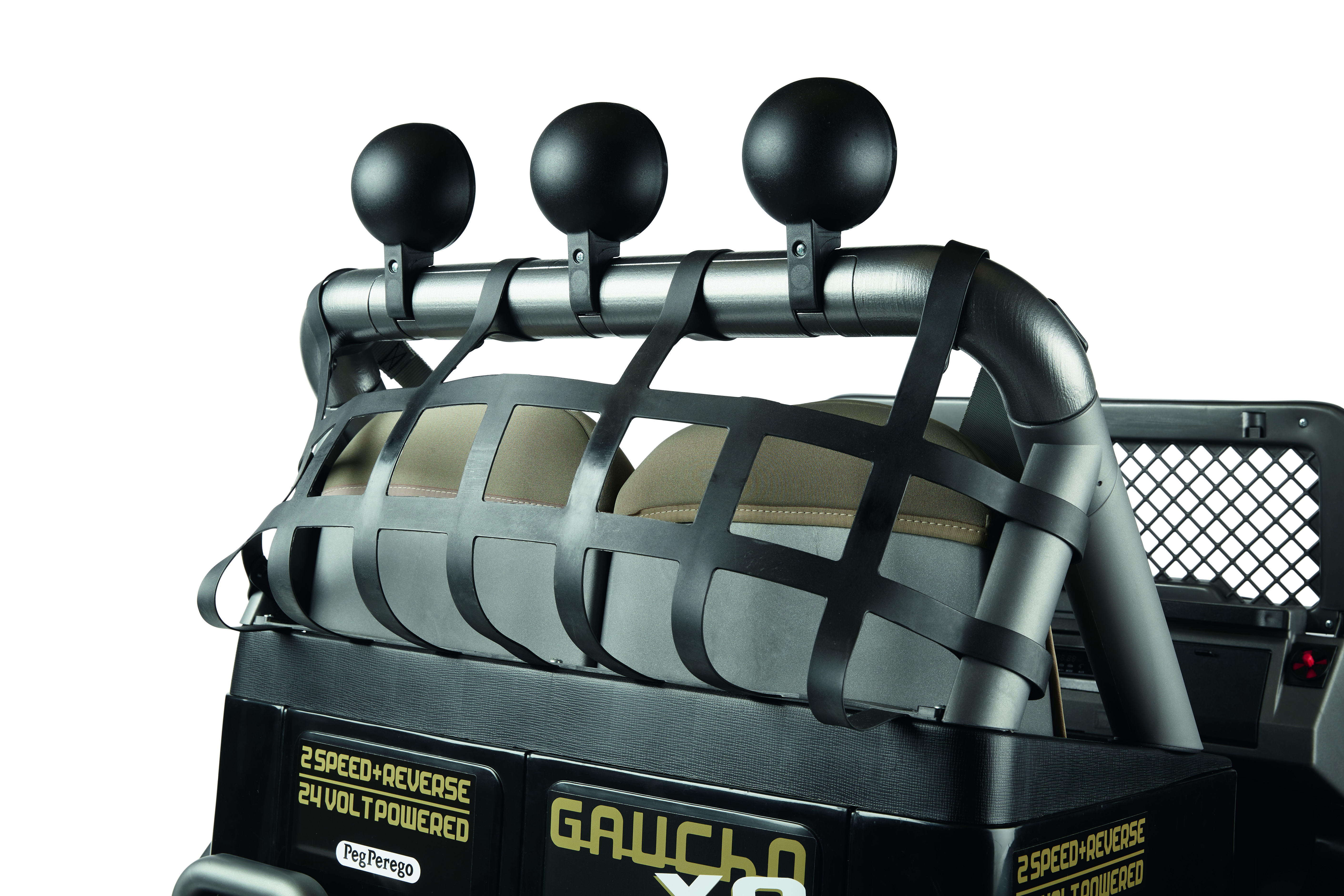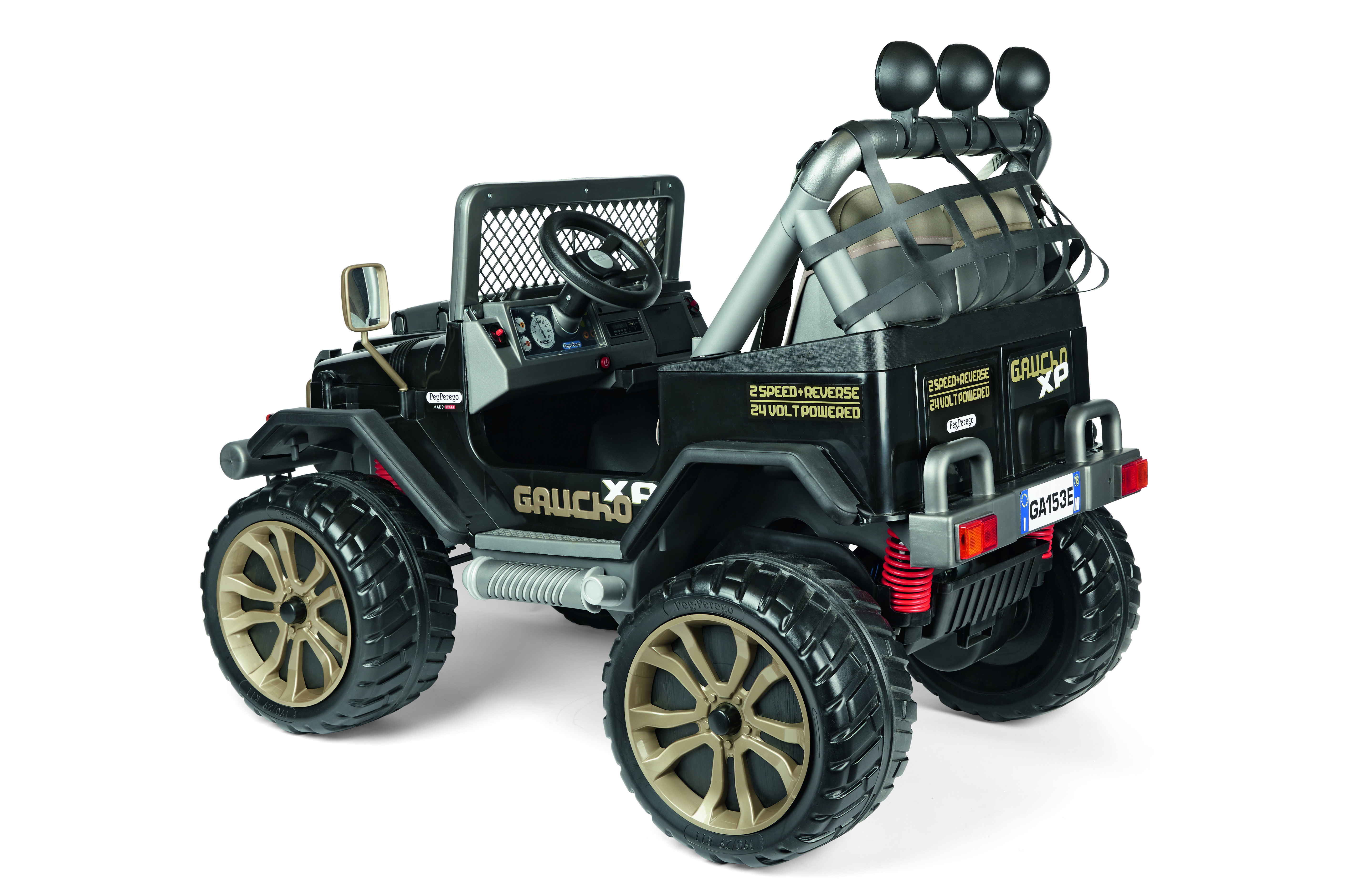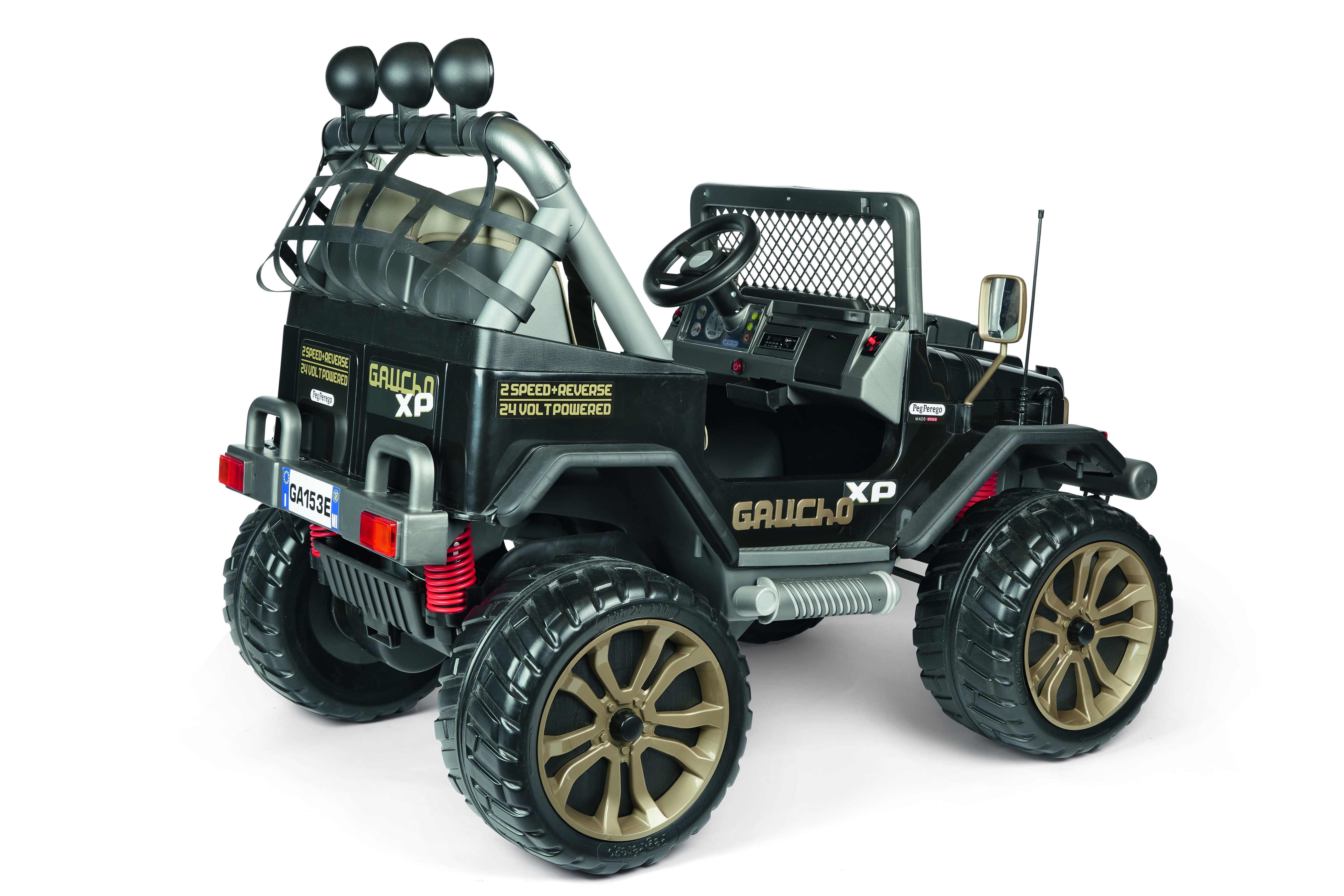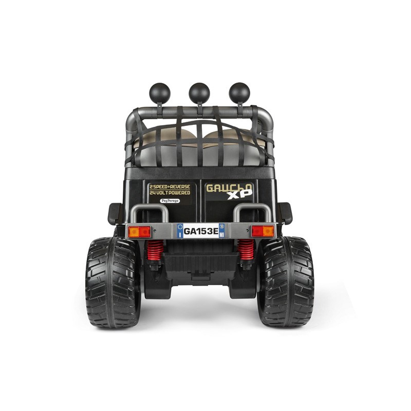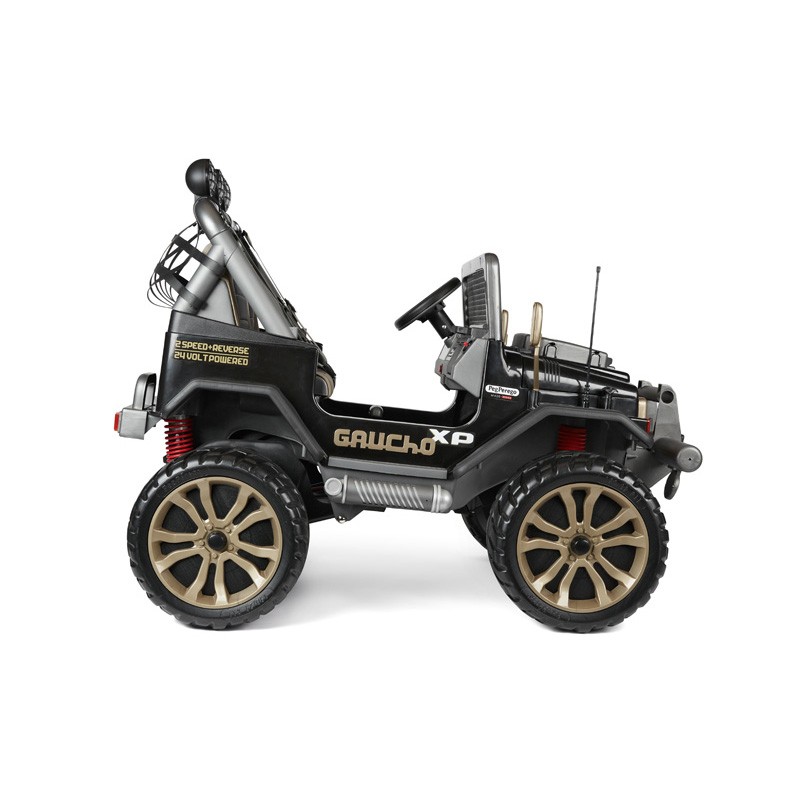 Blitzschnell fährt er auf Straßen, Wiesen, im Gelände, auf Bergstraßen mit bis zu 17 % Gefälle und sogar am Wasser. Dafür sorgen die leistungsstarken Stoßdämpfer an der Hinterachse, die zwei Vorwärtsgänge und der Rückwärtsgang. Der wendige und leicht zu fahrende Gaucho XP ist gemäß der Firmenphilosophie von Peg Perego für eine lange Lebensdauer konstruiert.