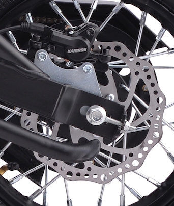 10 Zoll Luftbereifung hinten und 16 Zoll Luftbereifung vorne auf stabilen Metallspeichenfelgen, hydraulische Scheibenbremsanlage - billige Seilzugbremsen sind hier fehl am Platz. Eine ordentliche Federung ist selbstverständlich.